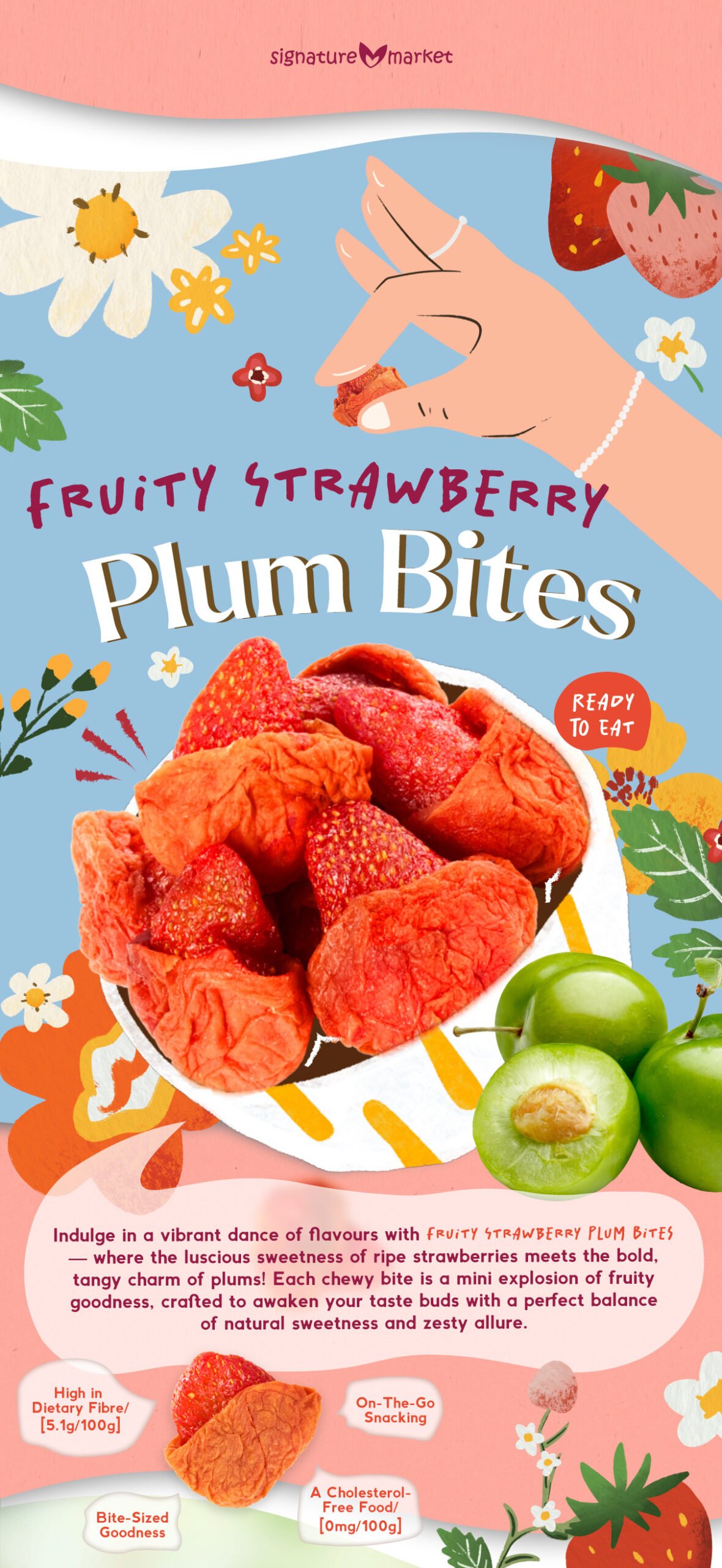 – Signature Market Fruity Strawberry Plum Bites are a sweet and tangy snack made from real fruit, featuring a combination of strawberry and plum.