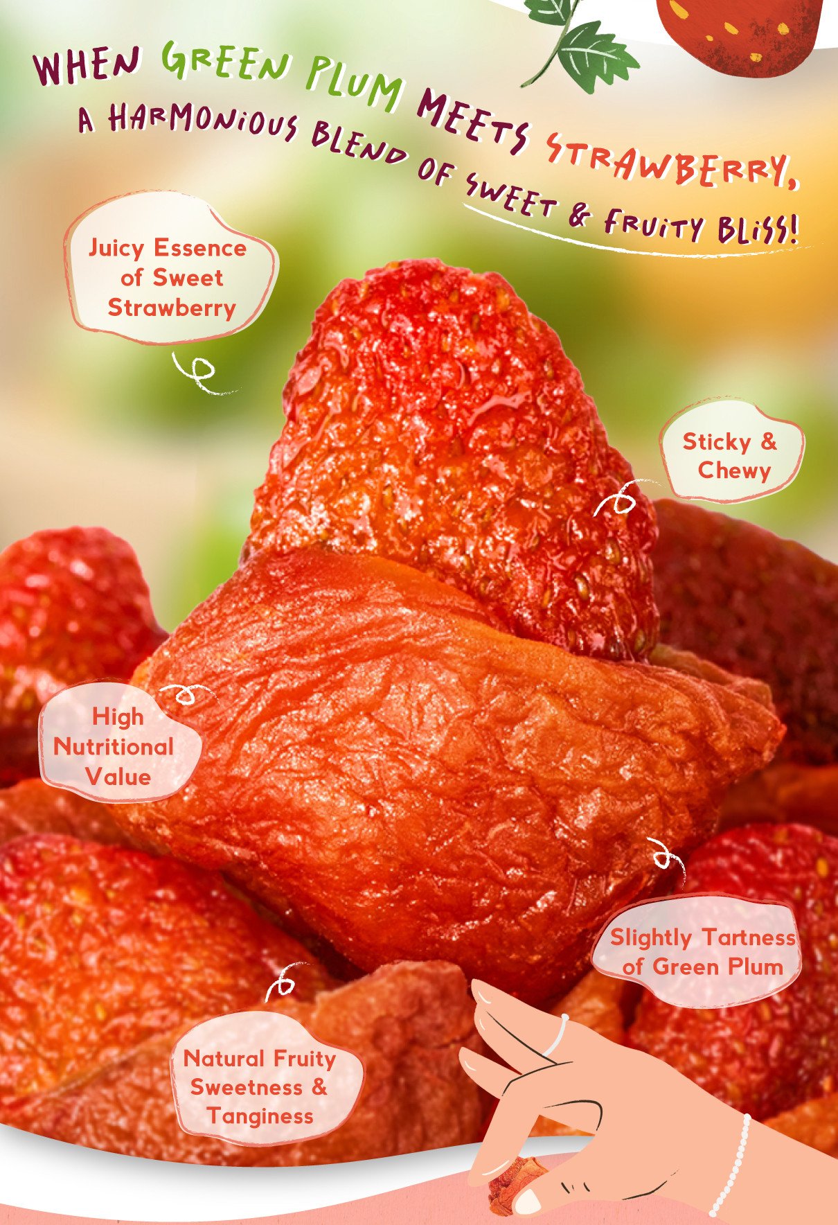 The strawberry provides a gentle sweetness while the plum adds a bold, tangy flavor, creating a sweet-and-sour harmony.