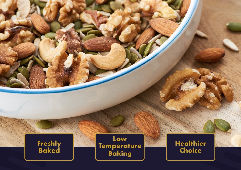The nuts and seeds are roasted at low temperatures to preserve their nutritional value.