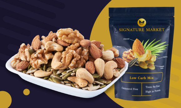 – Signature Market’s Low Carb Mix is a healthy snack made with a blend of nuts and seeds, designed to be a guilt-free and satisfying option.