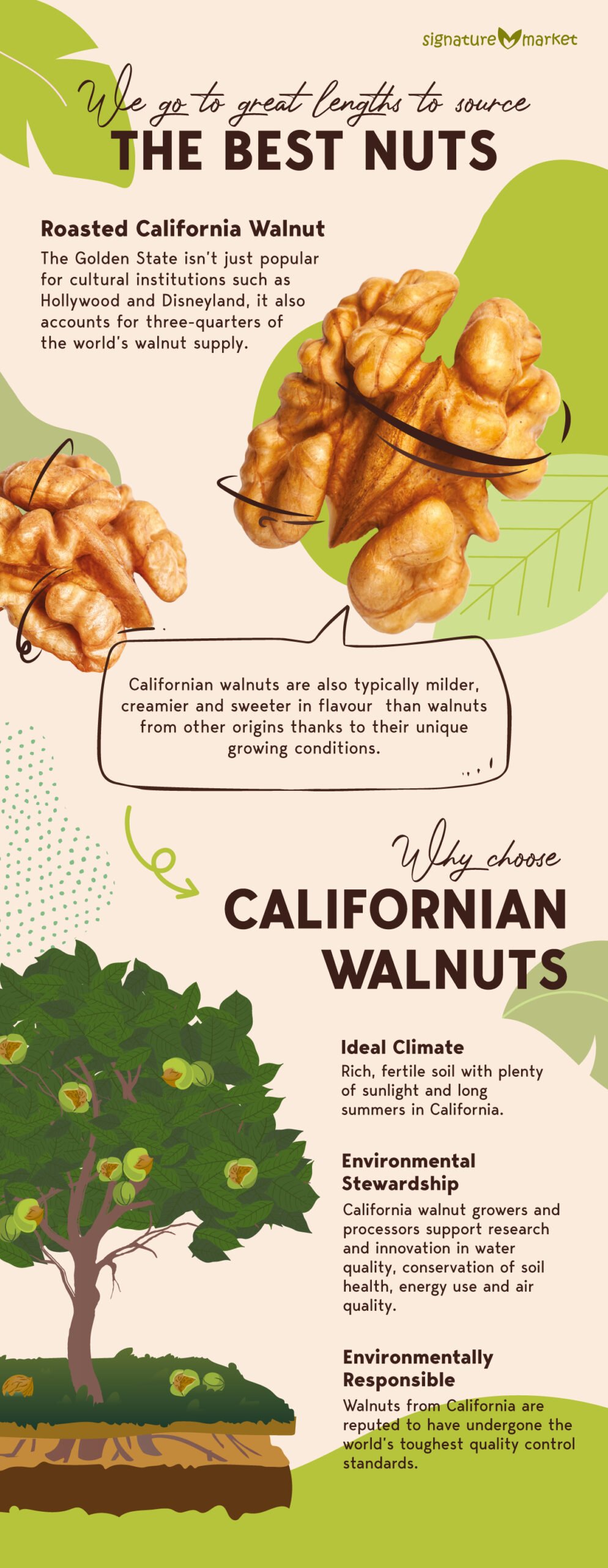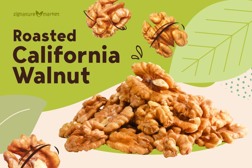 – Signature Market Roasted California Walnuts are known for being a healthy and brain-boosting snack, naturally rich in Vitamin E and Omega-3 fatty acids.