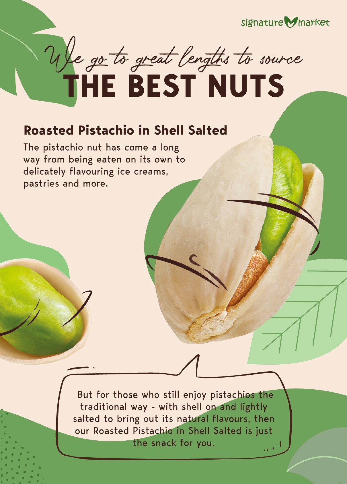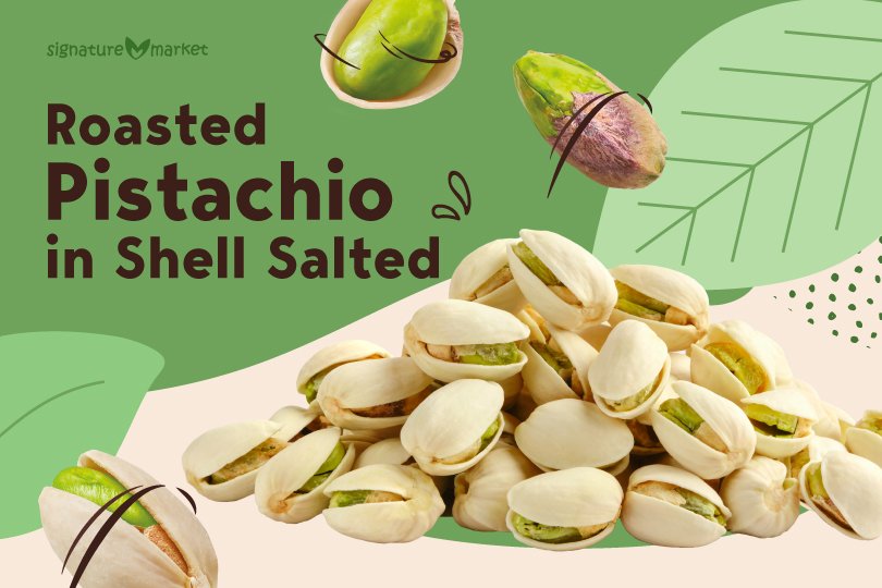– Signature Market Roasted Salted Pistachio in Shell is a snack featuring roasted pistachios with their shells on, lightly salted to enhance their natural flavors.