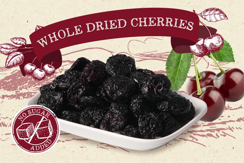– Signature Market Whole Dried Cherries are described as a sweet cherry variety cultivated in Chile, preserved in their own juices using a sugar-free method.